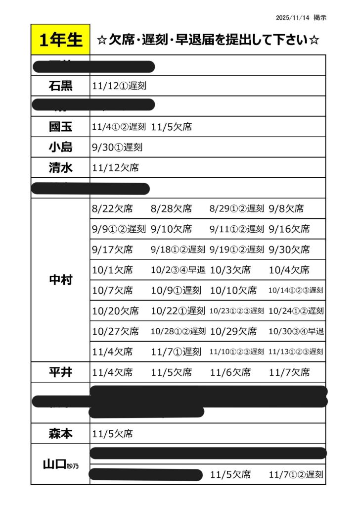 10月までの欠席等の届について、まだ提出していない方が数名おりますので、至急提出してください。