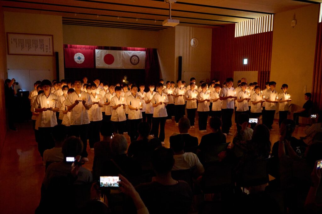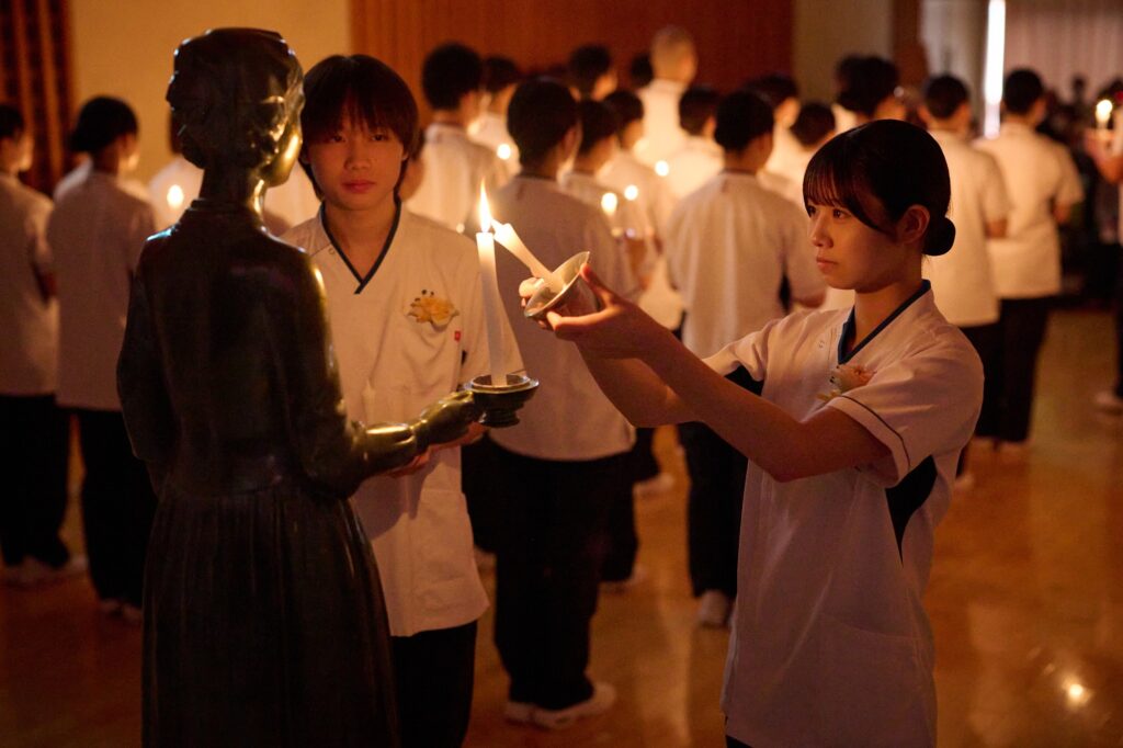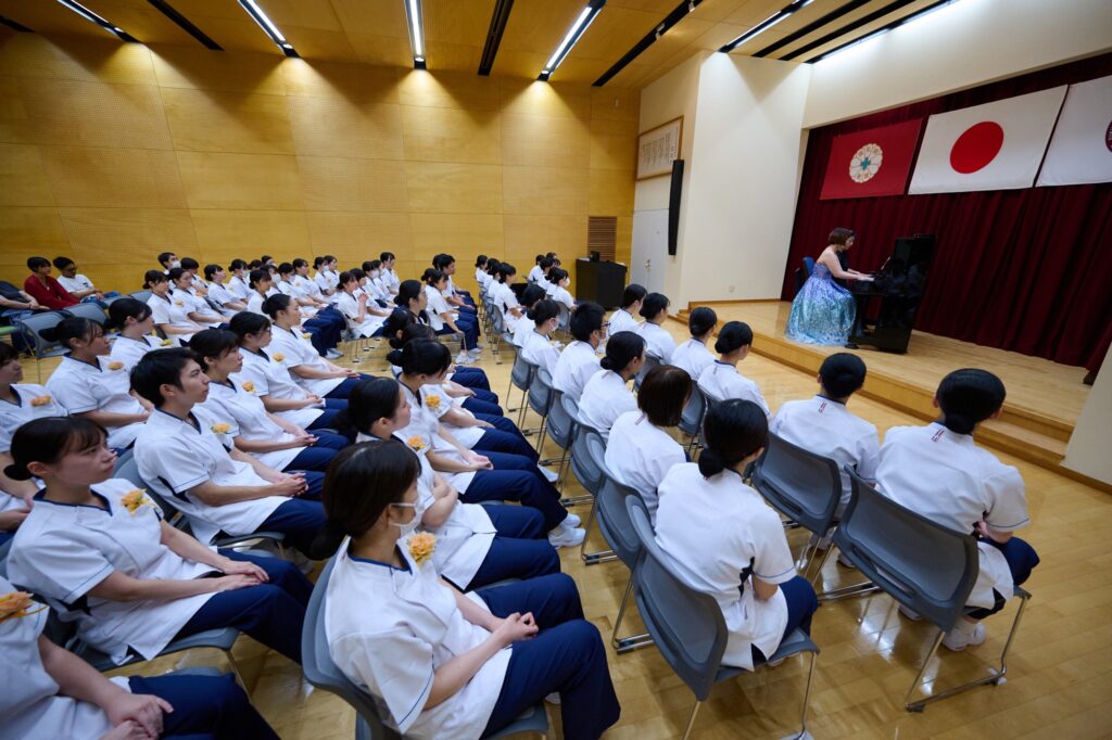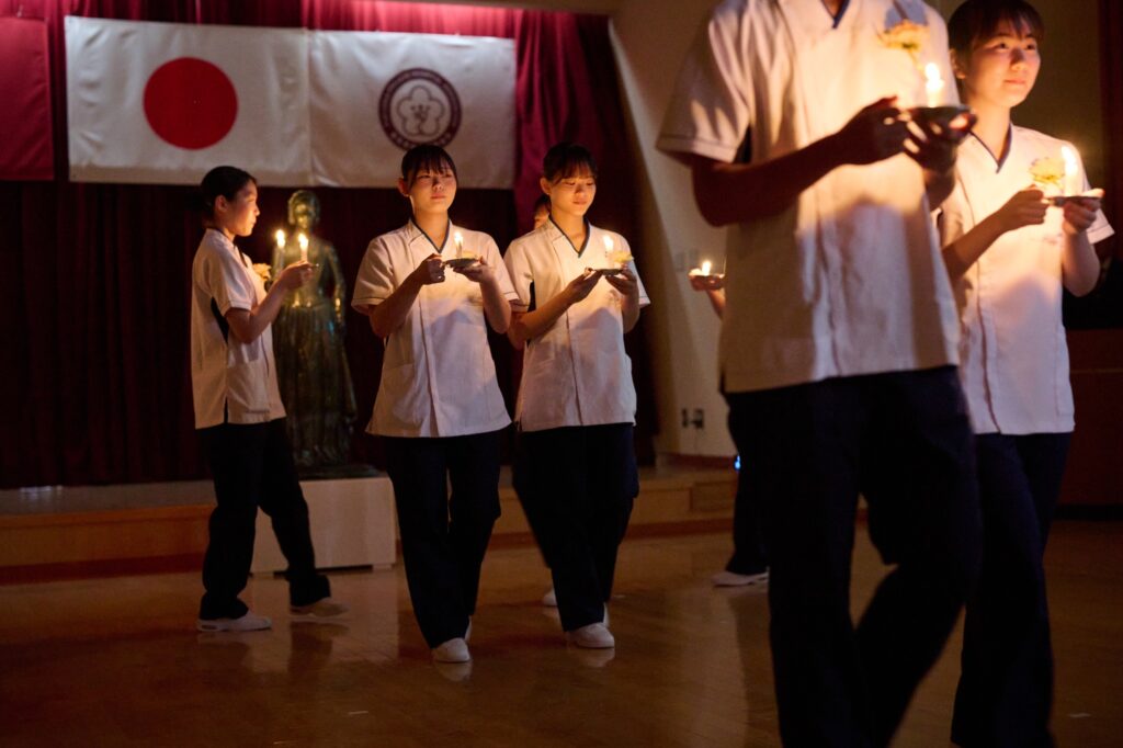 誓いの式は、病院での臨地実習に臨む前に、看護の道に進む決意表明と看護師としての責任の重さを自覚するために、毎年1年生が行っています。